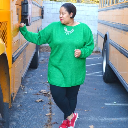 Yes, this outfit reminds me of Christmas too. LOL! When I put on the red sneakers and looked in the mirror, I had to laugh to myself. “Someone’s ready for the holiday’s” hubs said. Regardless of my Santa’s helper outfit, I’m more than happy to wear and style another one of fall’s fashion must haves – oversized sweaters….